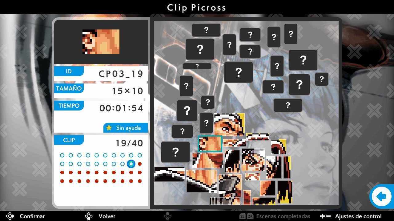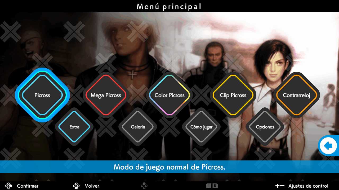 Ahora vamos a hablar brevemente de los diferentes modos que encontramos dentro de Picross S SNK Classics & NEOGEO edition. Tenemos un modo Picross, donde podemos jugar de forma normal; luego el modo Mega, un poco más complicado; el modo Color, donde se añade la complicación de usar colores; el modo Clip, donde creamos una imagen más grande con varios puzles unidos; el modo Contrarreloj, que debemos completar los puzles lo más rápido posible; y el modo Extra, donde encontramos los puzles más difíciles.