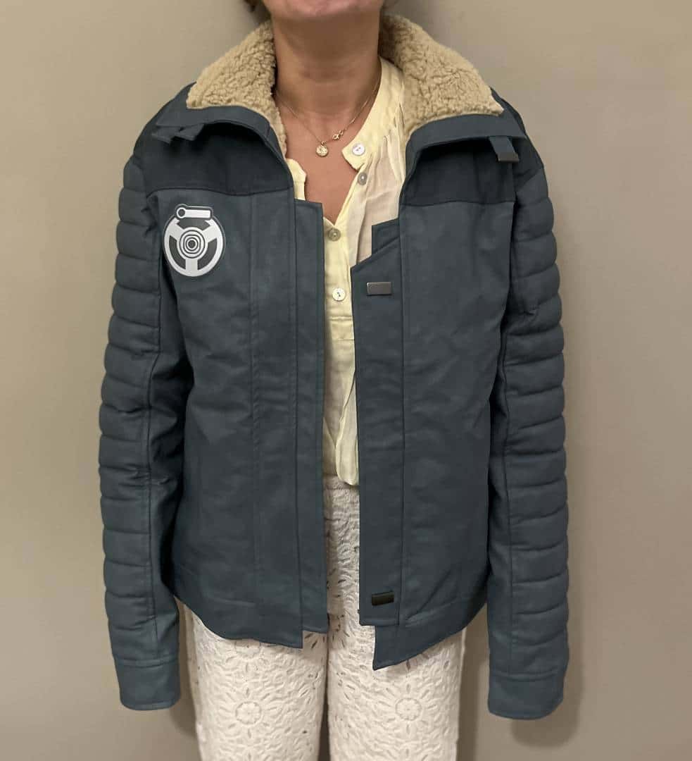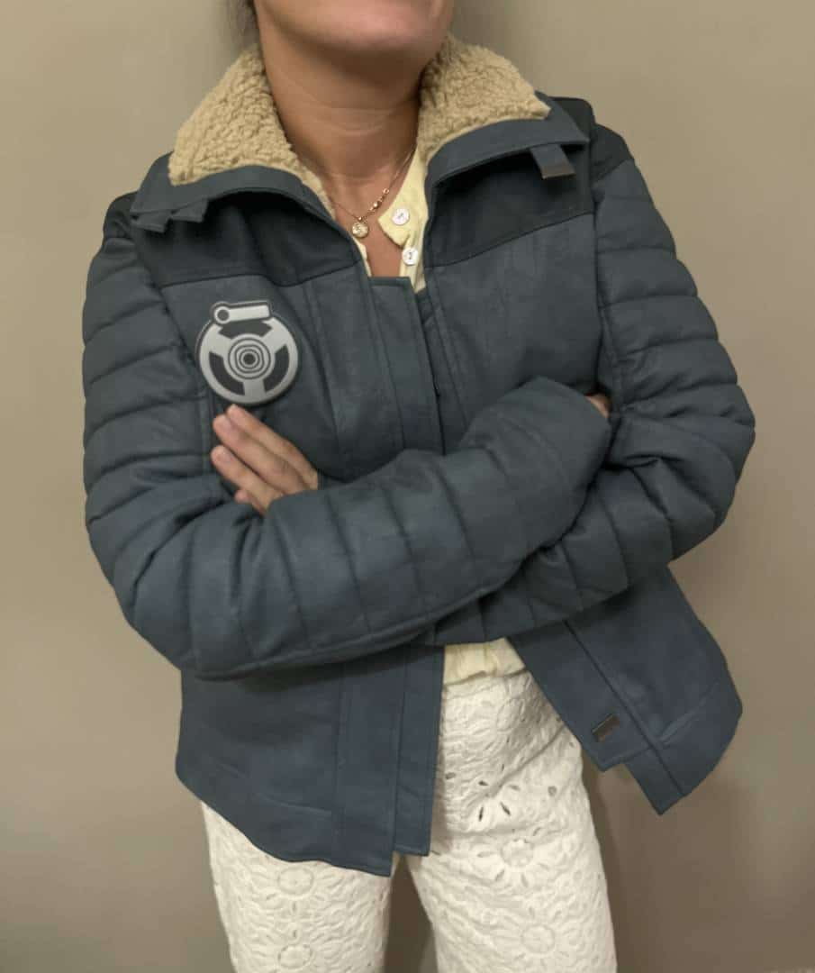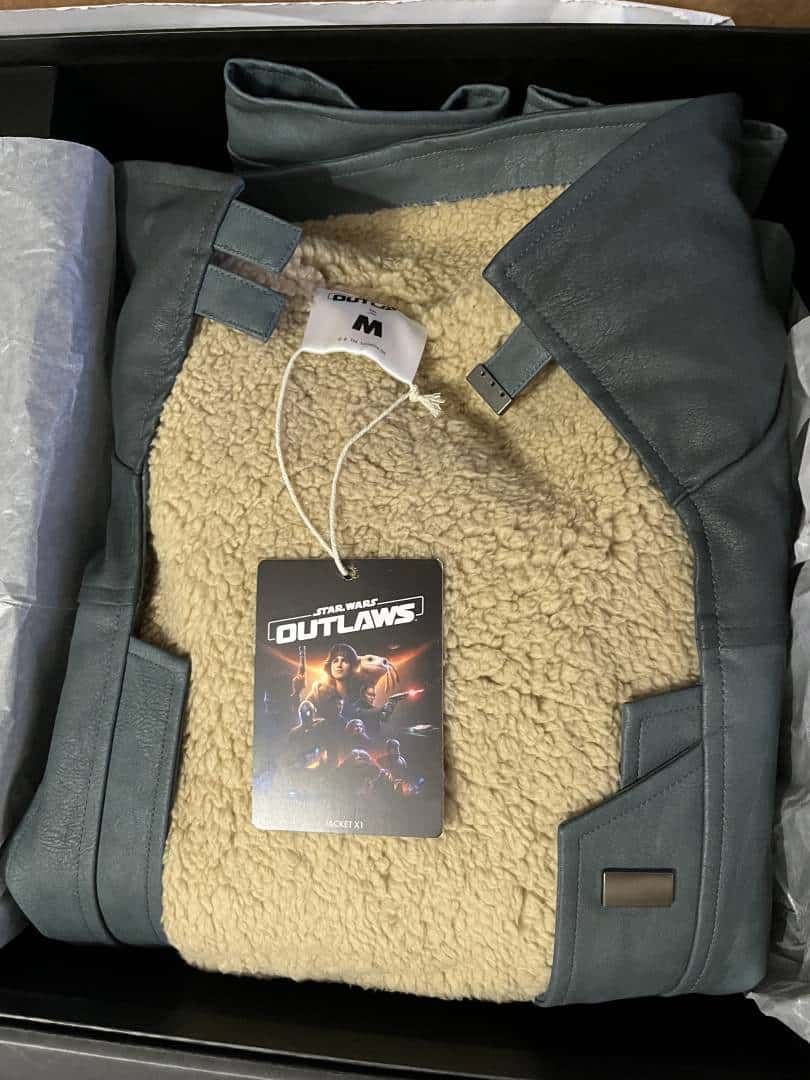 Para terminar os dejamos con las fotos de la joya de la corona de este kit de prensa. La réplica de la chaqueta que viste Kay Vess, la cazafortunas que protagoniza este Star Wars Outlaws. Como se puede ver es una réplica muy conseguida. De estilo biker o aviador, la chaqueta es de polipiel y su interior cuenta con un forro de pelo que servirá para que estemos calentitos con ella puesta.