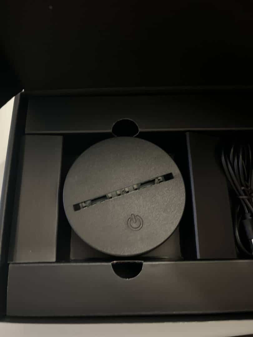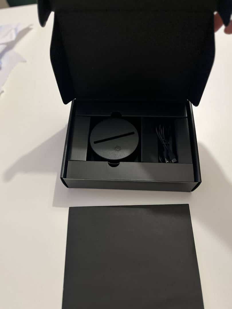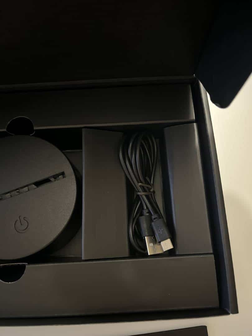 Comenzamos con el interior de la caja más grande, en la que está la base de la lámpara y el cable para conectarla a la corriente mediante USB.
