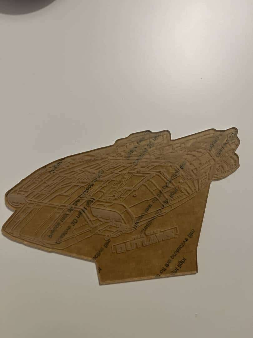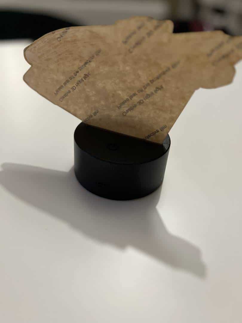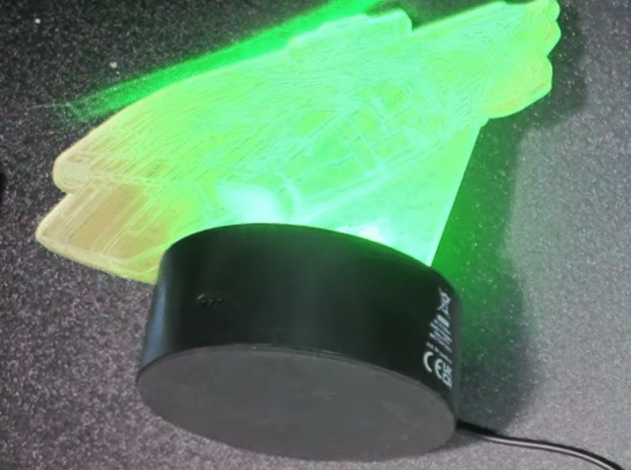 En un primer momento sentíamos que faltaba algo, porque no iba a ser un holograma como los de las películas (pero casi), y es que resulta que había también un sobre con una lámina acrílica (a la que aún no le hemos quitado la pegatina porque estaba pegada bastante bien para evitar rayajos) con la silueta de la nave de Kay Vess, la protagonista de esta aventura. Al conectar esta lámina a la base se ilumina desde abajo el dibujo de la nave en diferentes colores que podemos cambiar, como verde o morado.
