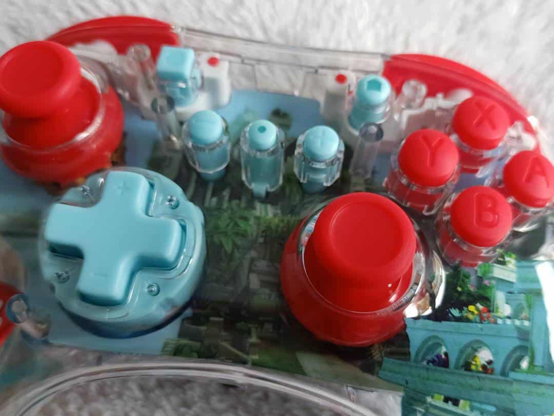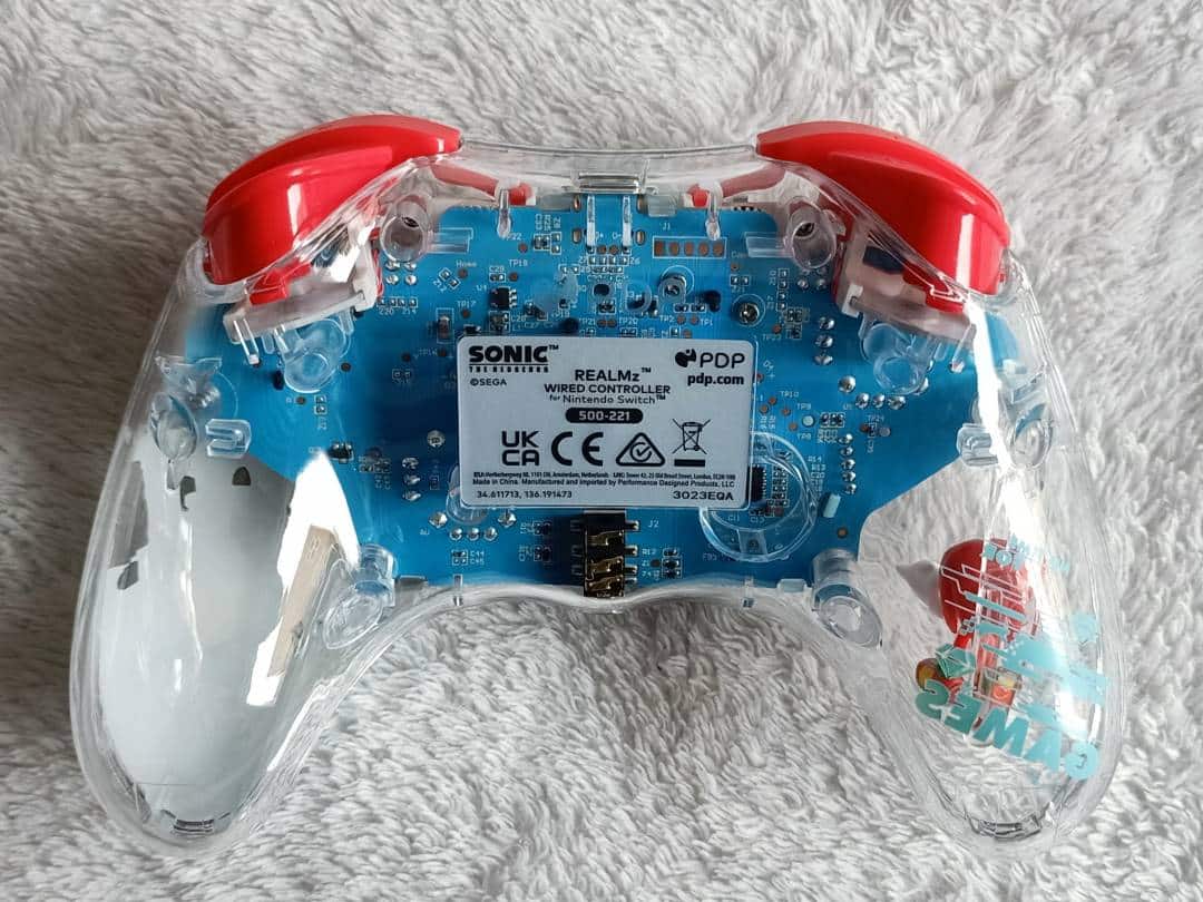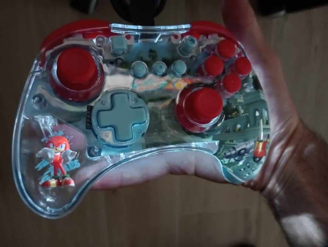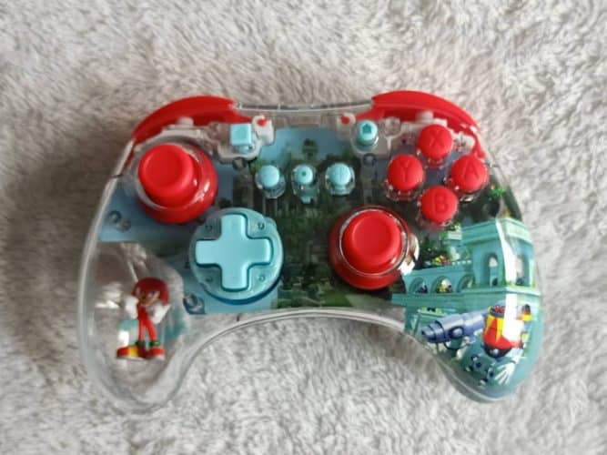 El resto de añadidos son estéticos y resultones. En primer lugar, tenemos un diseño transparente que cuenta con una ilustración a capas (para cubrir así también la placa) de Sky Sanctuary, el mítico escenario de Sonic 3 & Knuckles. En segundo, disponemos de una iluminación LED ajustable con los botones A, B, X e Y situada en la parte trasera del mando, con lo cual no molesta a los ojos si miramos al mando, y de noche nos permite ver los botones. Y en último, hay una figura (sí, una figura) dentro del controlador, situada en su esquina inferior izquierda.