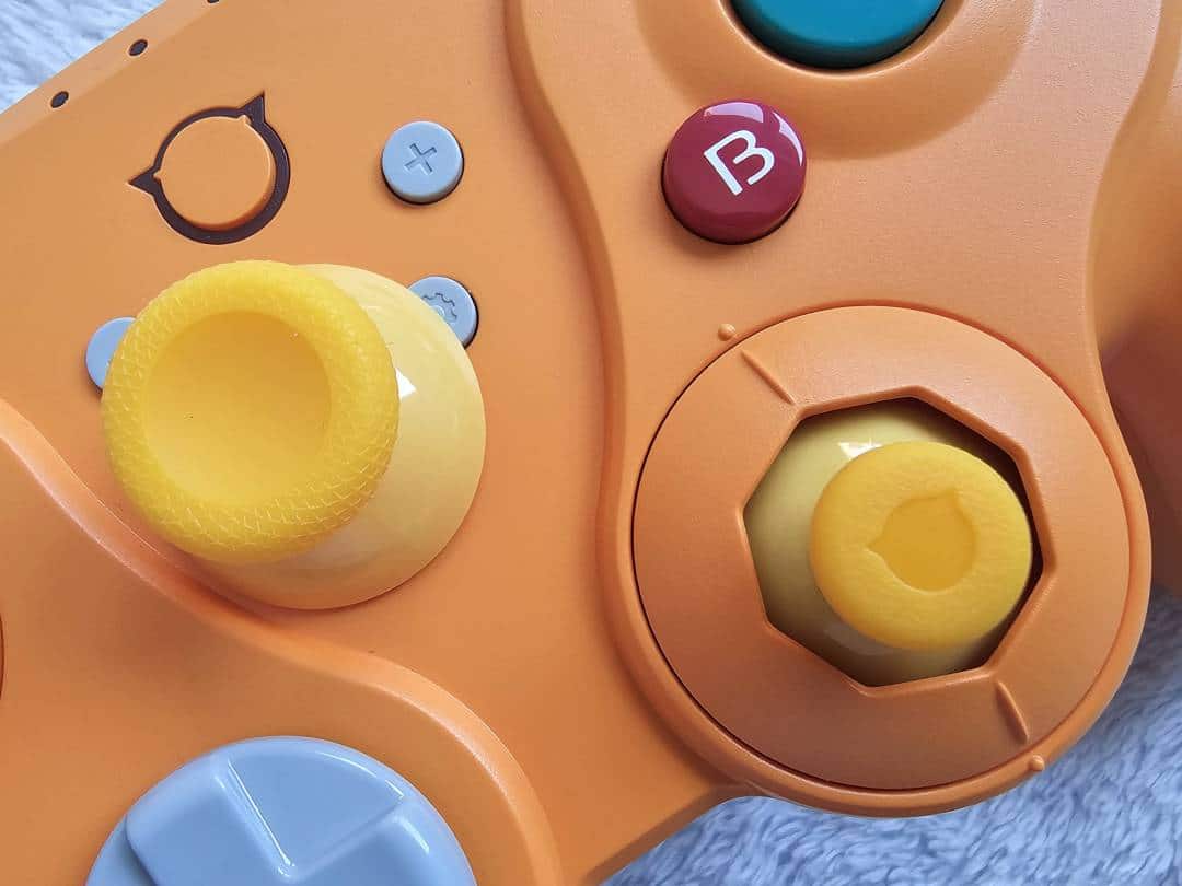 En su parte delantera encontramos el stick C al más puro estilo de GameCube, es decir, algo más pequeño que los estándares actuales. No obstante, podemos modificarlo también por un stick similar al izquierdo también, además de poder cambiar el círculo exterior a los sticks entre una versión que sea completatemente circular o una similar a la de GC con los 8 picos direccionales más marcados.