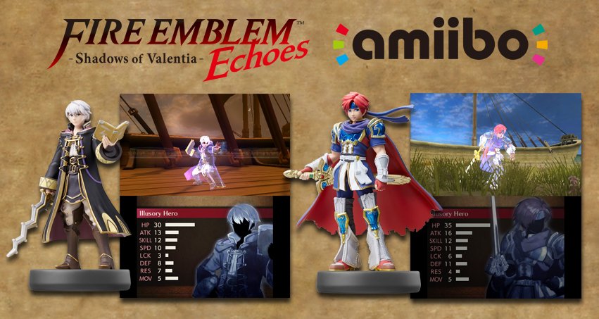 Tal como ocurrió en el anterior juego de la saga, Fire Emblem Echoes: Sombras de Valentia hará uso de las figuras amiibo. Esto quiere decir que al escanear una figura de Fire Emblem de la serie de Smash Bros., un héroe irreal será convocado para la batalla, con la finalidad de ayudar al jugador en sus arduas guerras.